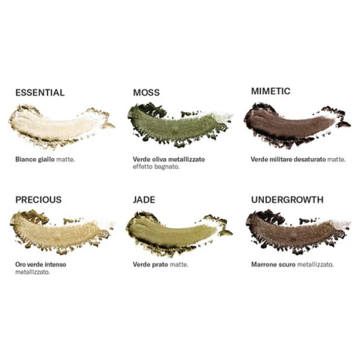 Per realizzare un look sfumato e allungato prelevare Jade e con il pennello morbido E01/E02 sfumarlo nella piega dell’occhio, successivamente con Mimetic e il pennello angolato E08 tracciare una linea di eyeliner sfumato seguendo la rima cigliare superiore. Essential con il pennello a setole piatte E03/E04 per sfumare i bordi verso l’esterno dell’occhio. Moss, Precious e Undergrowth possono essere utilizzati al centro della palpebra come punto luce, o all’inizio del dotto lacrimale. Queste tonalità sono valorizzate al massimo se applicate direttamente con il polpastrello.