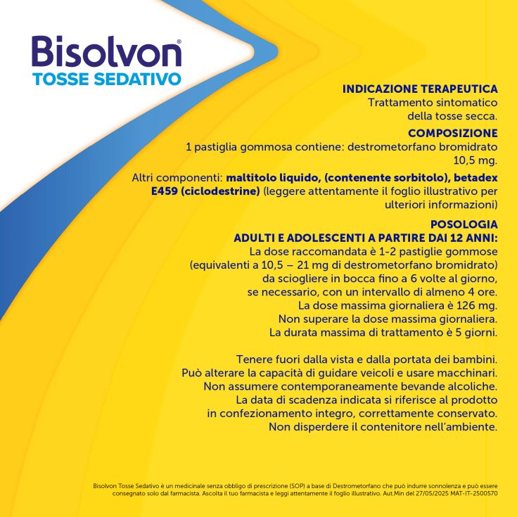 Non superare la dose massima di 8 pastiglie gommose al giorno (corrispondenti a 84 mg di destrometorfano bromidrato). - Per Bambini di età inferiore a 12 anni: Bisolvon tosse sedativo non deve essere usato. Se la tosse persiste per più di 5-7 giorni, consultare il proprio medico curante. Attenzione: non superare le dosi indicate senza il consiglio del medico.