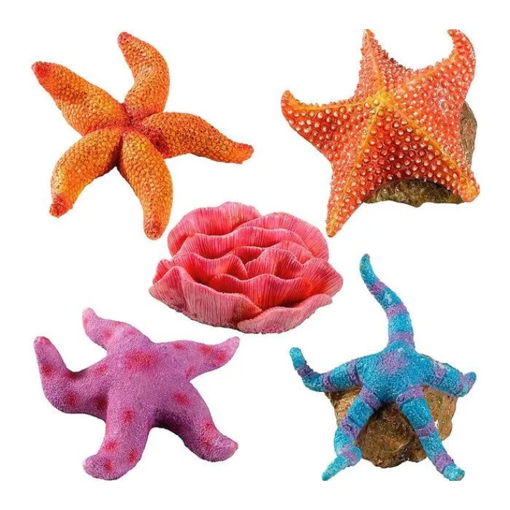 Perfetto per dare un tocco di allegria alla vasca dei pesci! BLU 9179 include colorati e originali arredi in resina per decorare il vostro acquario, tra i quali potrete trovare stelle marine e coralli, alcuni appoggiati su rocce, altri con base di appoggio.