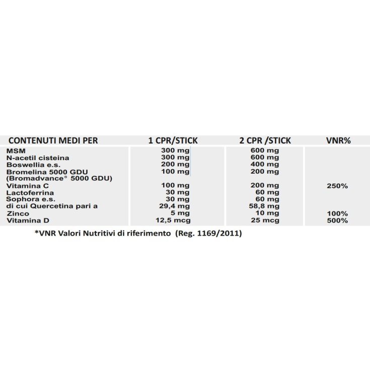Integratore a base di Bromelina 5000 GDU (Bromadvance 5000 Plus), MSM, N-Acetilcisteina e Boswellia, utile per la funzionalità articolare. Con Vitamina C, Vitamina D e Zinco che contribuiscono alla normale funzione del sistema immunitario. Contiene inoltre Lattoferrina e Quercetina.