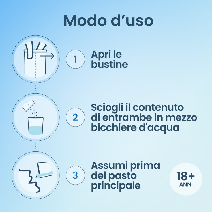 Adulti: 1 bustina al giorno da somministrare a intervalli regolari preferibilmente prima del pasto principale per 10 giorni.