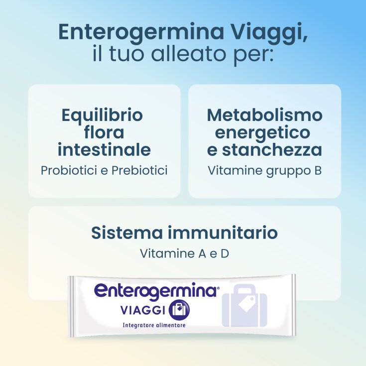 Enterogermina Viaggi è un integratore alimentare a base di 6 Miliardi di S. boulardii, Vitamina A, D e Vitamine del gruppo B, arricchito con fibre prebiotiche, in bustine orosolubili da assumere senza acqua, pratiche da portare con sé durante viaggi o vacanze.