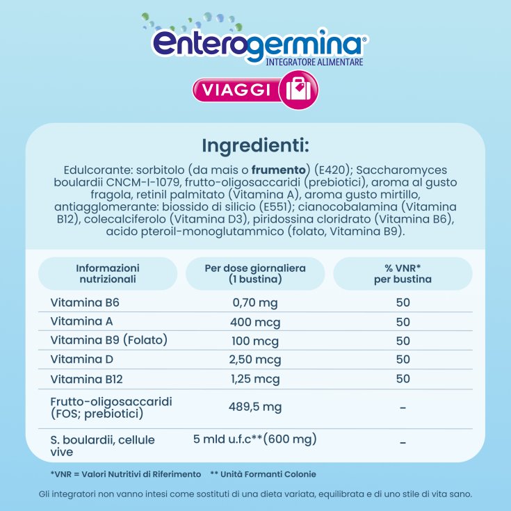 Lo stress, il cambio di abitudini o il fuso orario possono mettere a dura prova l’intestino, soprattutto durante i lunghi viaggi. Enterogermina Viaggi è un integratore alimentare a base di probiotici, vitamine del gruppo B, vitamina D e vitamina A. Le vitamine del gruppo B, in particolare la vitamina B6 e la vitamina B12, aiutano il regolare funzionamento del metabolismo energetico, e insieme alla vitamina B9, contribuiscono alla riduzione di stanchezza ed affaticamento. La Vitamina D contribuisce al mantenimento della normale funzione muscolare e aiuta il regolare funzionamento difese immunitarie. Il probiotico S.boulardii favorisce l’equilibrio della flora batterica intestinale. La confezione contiene 12 bustine orosolubili per adulti, da assumere in modo pratico, pensate appositamente per i viaggi. Assumere 1 bustina al giorno: porre il contenuto direttamente sulla lingua, senz'acqua.