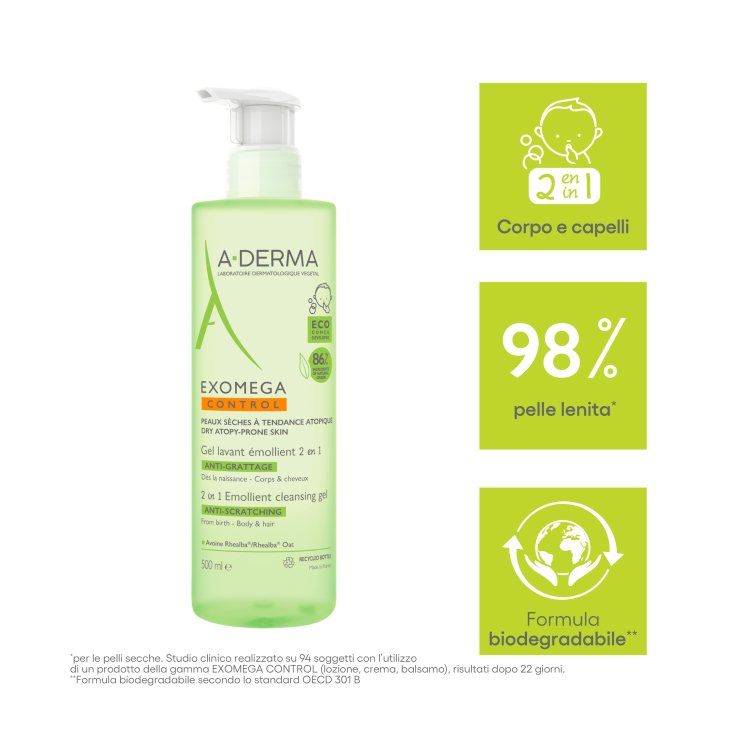 I Laboratori di dermocosmetica vegetale A-Derma hanno sviluppato EXOMEGA CONTROL GEL DETERGENTE EMOLLIENTE 2 in 1, un prodotto per l'igiene delicata dei bebé e bambini con pelle secca a tendenza atopica che può essere utilizzato fin dalla nascita. In un solo gesto, la schiuma leggera di questo gel senza sapone deterge il corpo e i capelli, dando sollievo e proteggendo la pelle fragile e il cuoio capelluto. Grazie a principi attivi rigorosamente selezionati per le loro proprietà addolcenti e lenitive, EXOMEGA CONTROL GEL DETERGENTE EMOLLIENTE 2 in 1 deterge, idrata e lenisce. La sua formula BIODEGRADABILE* con l'86% di ingredienti di origine naturale è stata testata sotto controllo oftalmologico, dermatologico e pediatrico e può essere utilizzata fin dalla nascita. Pratico e sicuro, EXOMEGA CONTROL GEL DETERGENTE EMOLLIENTE 2 in 1 semplifica la vita dei genitori avvolgendo la pelle e i capelli dei bebé e dei bambini in una morbidezza lenitiva.