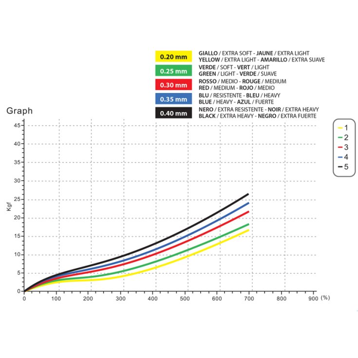 Fasce senza lattice in 7 colori relativi ai diversi livelli di resistenza e 3 lunghezze (1,5, 5,5 e 45 m).
