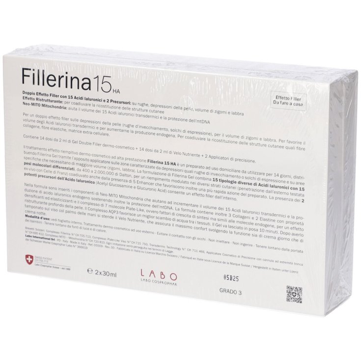Il trattamento effetto riempitivo dermo-cosmetico ad alta prestazione Fillerina 15 HA è un preparato ad uso domiciliare da utilizzare per 14 giorni, distribuendo Fillerina gel tramite l'apposito applicatore sulle zone caratterizzate da depressioni quali rughe di invecchiamento o solchi di espressione e su aree specifiche che necessitano di maggiore volume (zigomi, labbra). La formulazione di Fillerina gel combina 15 tipologie diverse di acidi ialuronici con 15 pesi molecolari differenziati, da 400 a 2.000.000 di Dalton, per un riempimento modulato nei diversi strati cutanei (penetrazione dall'esterno testa ex-vivo con celle di Franz) coadiuvato anche dalla presenza di 5 Enhancer che favoriscono inoltre una più rapida azione del preparato. La presenza dei 2 potenti precursori dell'acido ialuronico (acetyl glucosamine e glucuronic acid) consente un effetto filler dall'interno. Nella formula sono inseriti i componenti di Neo-MITO mitochondria che aiutano ad incrementare il volume dei 15 acidi ialuronici transdermici e la produzione di acido ialuronico endogeno sostenendo inoltre la protezione dell'mtDNA. La formula contiene inoltre 3 collageni e 2 elastine con proprietà densificanti ed elasticizzanti e il complesso di 7 molecole Plate-Like, ovvero fattori di crescita di sintesi ma simili alle molecole endogene, per un effetto ristrutturante profondo della pelle. Il complesso AQP3 favorisce un miglior scambio di acqua tra i tessuti.