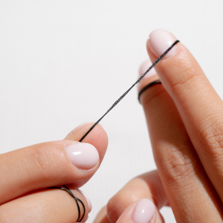 Filo interdentale espandibile e cerato di colore nero, delicato sulle gengive.