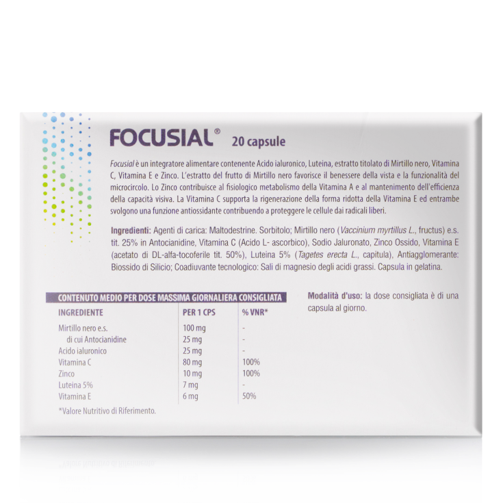 Focusial è ideale per chi desidera mantenere la salute degli occhi e proteggersi dallo stress ossidativo, grazie alle proprietà antiossidanti della Vitamina C e della Vitamina E.
