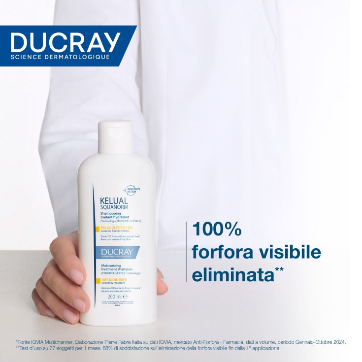 KELUAL SQUANORM shampoo trattante idratante specifico per forfora secca rappresenta la prima generazione di shampoo anti-forfora ad alte prestazioni ispirati agli effetti benefici e prolungati dei probiotici. Grazie alla tecnologia PROBIOTIC-SCIENCE, elimina delicatamente il 100% della forfora visibile fin dalla 1° applicazione* e ne previene la ricomparsa con un’efficacia per 2 mesi**. Riscopri un cuoio capelluto equilibrato, idratato e lenito con un solo shampoo*.