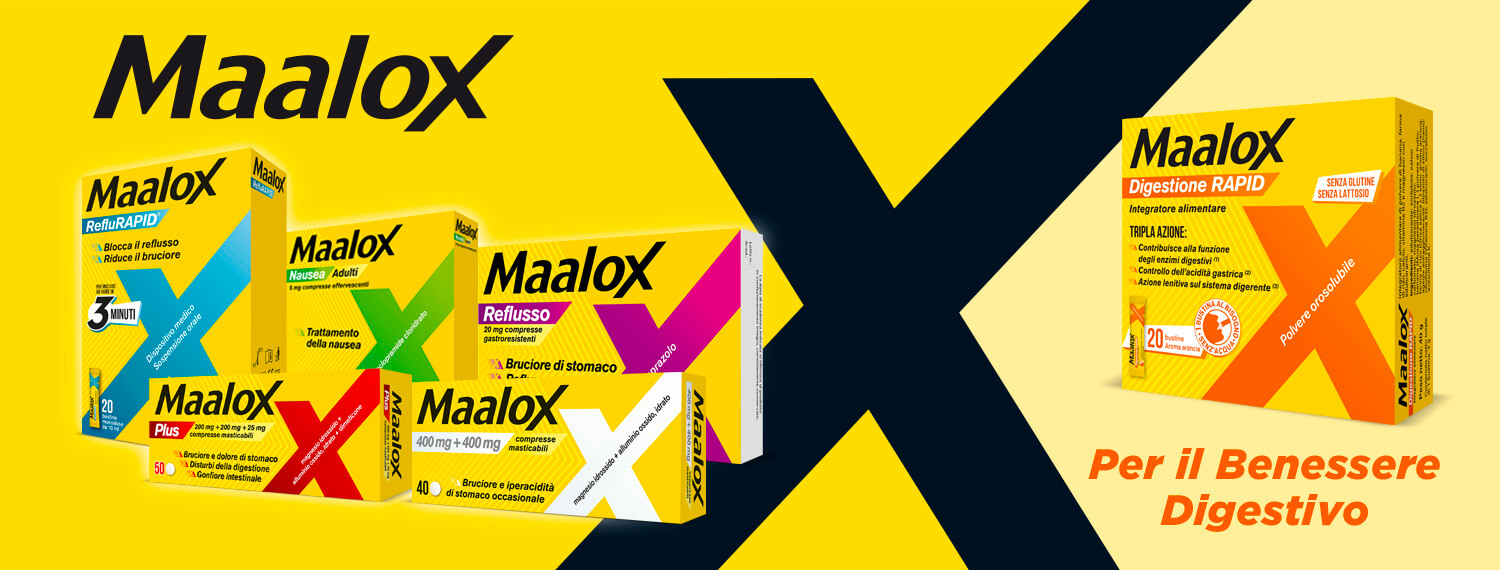 Maalox Plus e Maalox sono medicinali. Maalox Nausea è un medicinale a base di metoclopramide cloridrato. Maalox Reflusso è un medicinale a base di pantoprazolo. Leggere attentamente i fogli illustrativi. Aut. Min. del 17/06/2025. Maalox RefluRAPID è un dispositivo medico CE0373. Leggere attentamente le avvertenze o le istruzioni per l’uso. Aut. Min. del 17/06/2025. MAT-IT-2500513. È autorizzato dal Ministero della salute esclusivamente il contenuto pubblicitario relativo a Maalox Plus, Maalox, Maalox Nausea, Maalox Reflusso, Maalox RefluRAPID. Eventuali informazioni riguardanti prodotti diversi presenti nella pagina del sito web sono di esclusiva responsabilità dell’Azienda. Maalox Digestione RAPID è un integratore alimentare. Gli integratori non vanno intesi come sostituti di una dieta variata, equilibrata e di uno stile di vita sano. MAT-IT-2500513.