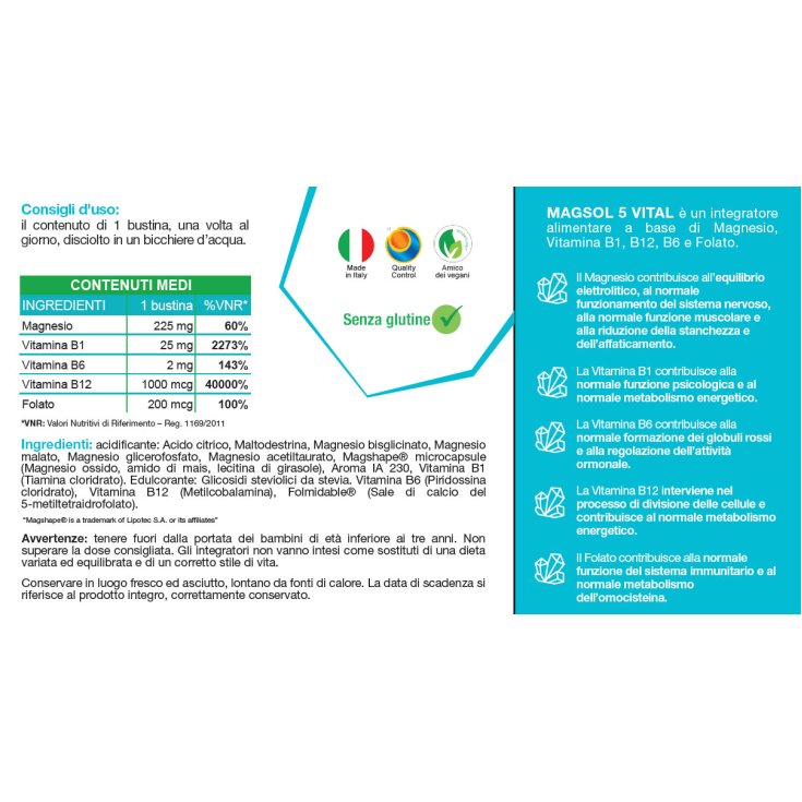 MAGSOL 5 VITAL è un integratore alimentare a base di Magnesio, Vitamina B1, B12, B6 e Folato.