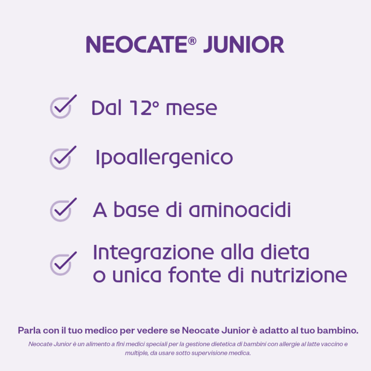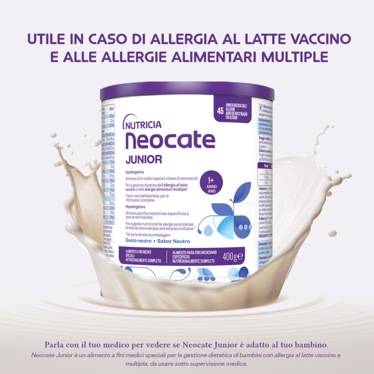 La dose giornaliera di Neocate Junior dipende da età, peso e condizioni di salute del bambino e deve essere stabilita dal medico.