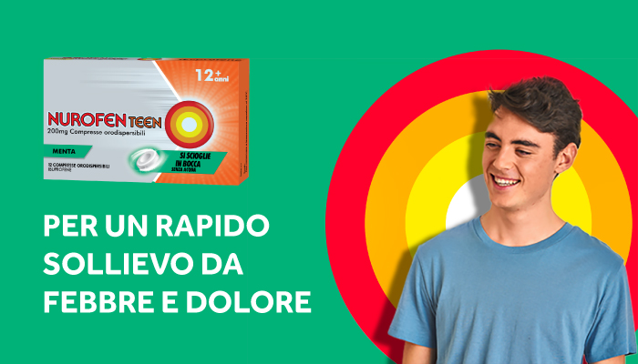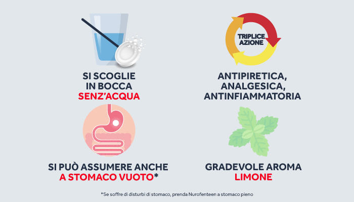 Nurofenteen è una pratica compressa che si scioglie in bocca all’aroma di limone e/o menta che offre un sollievo rapido da mal di testa, dolore e febbre.