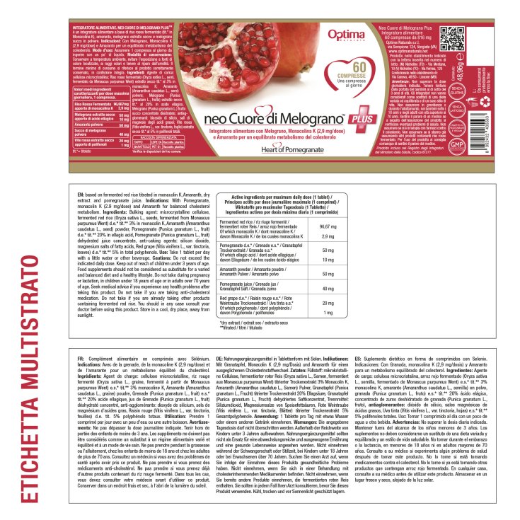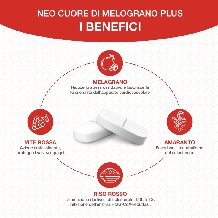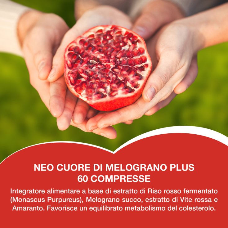 Neo Cuore di melograno Plus è un integratore alimentare a base di Riso Rosso Fermentato, Amaranto, Vite rossa, Melograno estratto secco e Melograno succo in polvere. L’Amaranto favorisce il normale metabolismo del colesterolo.