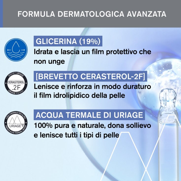Grazie all'Acqua Termale di Uriage e al brevetto Cerasterol 2F questo prodotto offre alla pelle un'azione lenitiva duratura e rinforza il film idrolipidico della pelle.