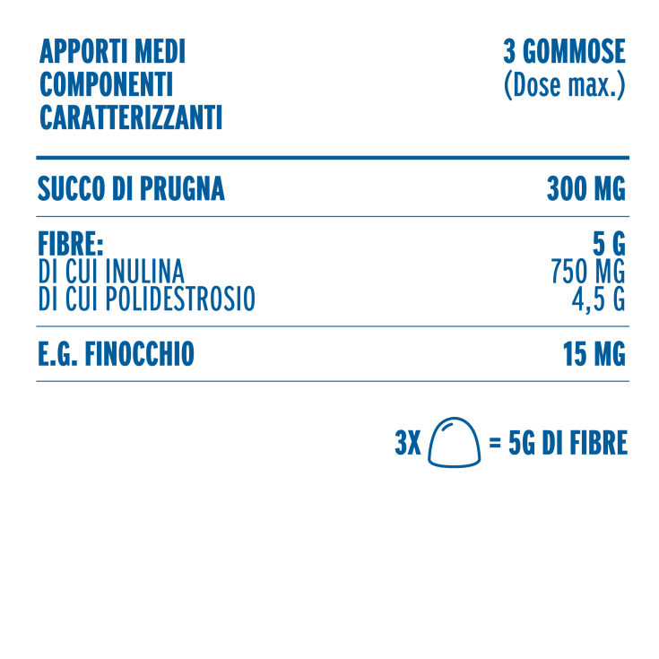 Assumere fino a 3 gommose al giorno in base alla necessità. L’integrazione con 3 gommose apporta 5 g di fibra.