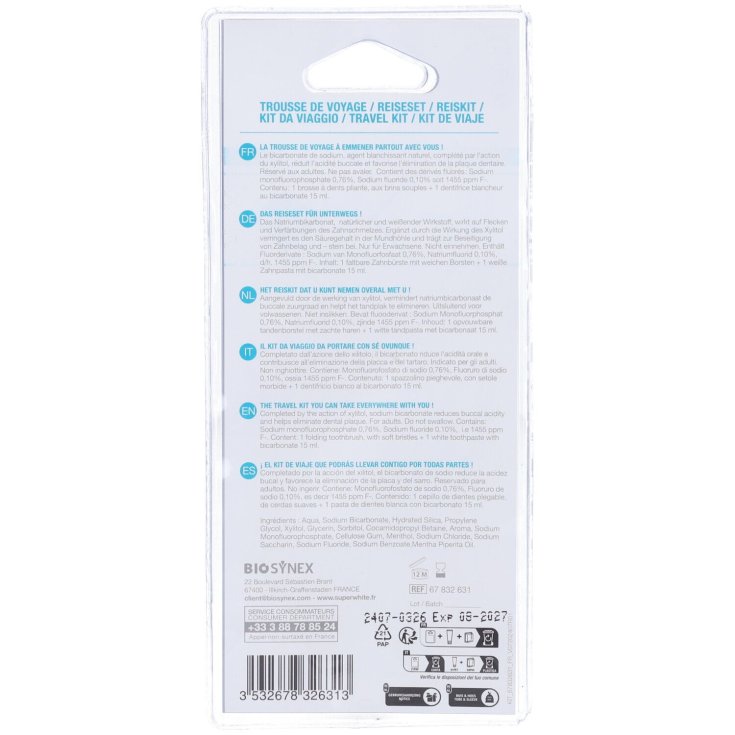 - Dentifricio Superwhite (15ml): Formato approvato per il trasporto dei liquidi in aereo, ideale per rinfrescare l'alito e proteggere lo smalto durante i tuoi spostamenti.