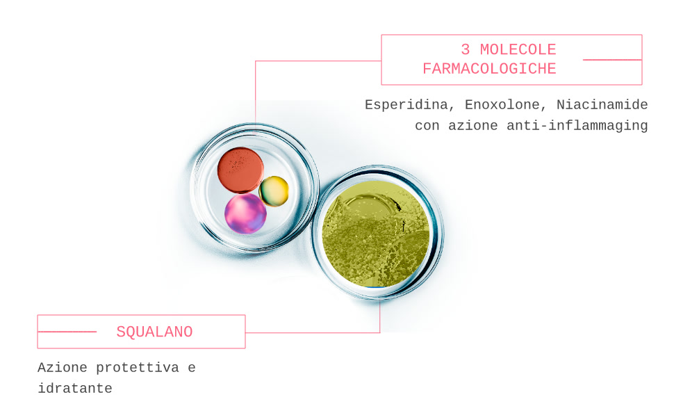 Una potente combinazione di principi attivi dermatologici comeesperidina,enoxolone e niacinamide. Queste tre molecole farmacologiche lavorano in sinergia per lenire l'infiammazione associata alla rosacea, regolare gli squilibri cutanei e rafforzare la barriera protettiva della pelle. Ogni applicazione lascia sulla pelle una texture fresca e leggermente verde che neutralizza istantaneamente il rossore per un effetto correttivo immediato.
