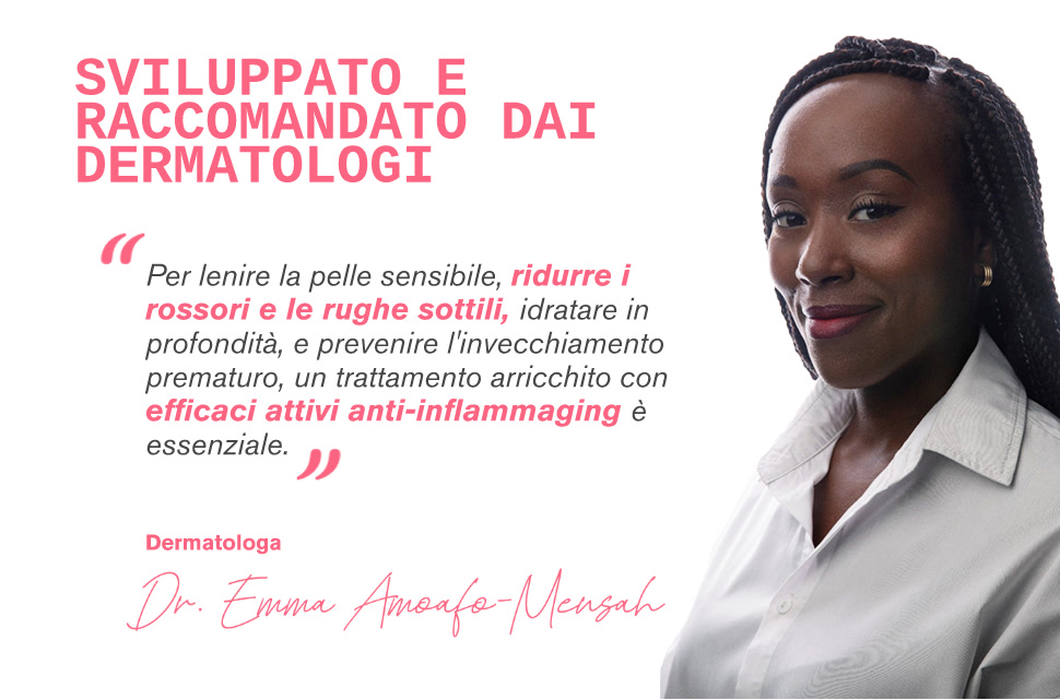 La combinazione del complesso TLR2-Regul e del complesso SK5R rappresenta una vera e propria rivoluzione nella lotta contro l'infiammazione, il processo che accelera l'invecchiamento cutaneo nelle pelli sensibili e soggette a rosacea. Questi principi attivi agiscono in modo mirato sulla Kallikrein-5, un enzima responsabile di problemi vascolari e infiammatori, per dare un sollievo duraturo alla pelle e prevenire future irritazioni.